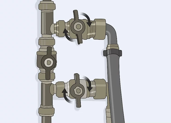 - شیر ها را در موقعیت اصلی خود قرار دهید. شیر بای پس را با چرخاندن آن ببندید تا بال های دستگیره عمود بر لوله باشد. شیر های ورودی و خروجی را با چرخاندن آنها باز کنید تا بال ها به طور موازی با شیلنگ ها قرار گیرد.