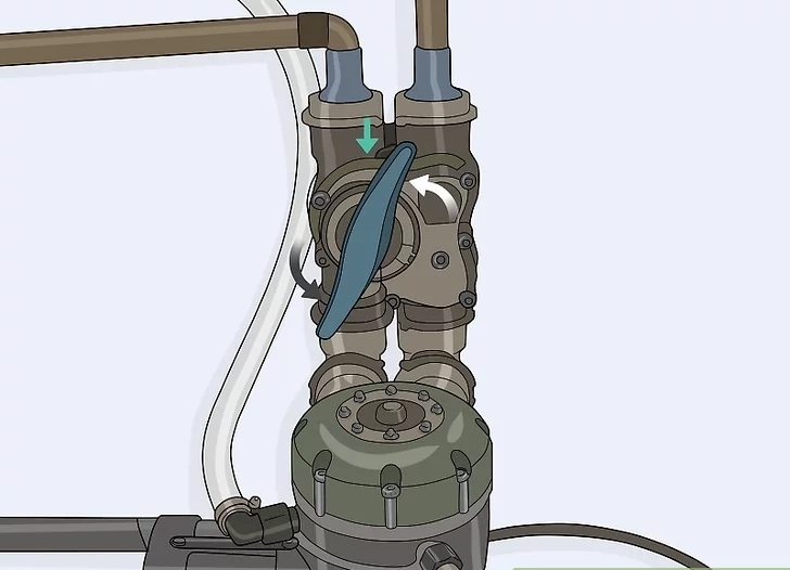 - .شیر بای پس را با چرخاندن آن باز کنید تا دستگیره با لوله هماهنگ باشد. شیر بای پس، سومین شیر است که بین شیرهای ورودی و خروجی در لوله اصلی قرار دارد. آن را 90 درجه بچرخانید تا بال ها به موازات لوله اصلی قرار گیرند تا در آن باز شود و بای پس آغاز شود. به این طریق اب بدون ورود به دستگاه تصویه وارد شیر اب میشود.