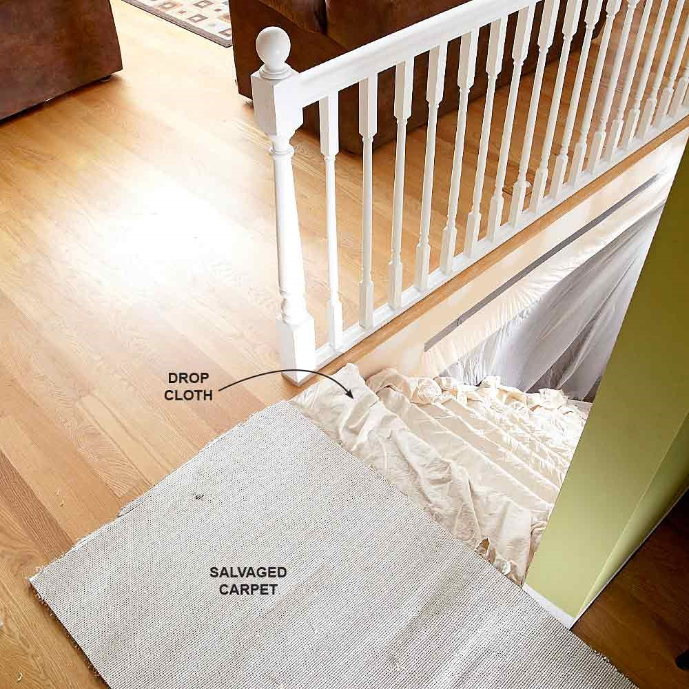 امکان ندارد بدون ایجاد خرابکاری، دیوار یا سقفی را از میان بردارید. اما این بدان معنا نیست که این بهم ریختگی در تمام قسمت های خانه به وجود آید. دفعه باید باید فرش یا پارچه ای را ببُرید و آن را به صورت چندین نوار بلند بُرش دهید و از آن به عنوان مسیر محافظ کفپوش در سایر مناطق خانه استفاده کنید. حتما پارچه را وارونه بکشید تا تکیه گاه ساینده در انتهای کفهای چوب خراشیده نشود. از پارچه های قدیمی و کهنه نیز میتوان برای محافظت از پله ها استفاده کرد.